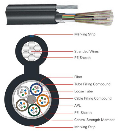 The fibers, 250μm , are positioned in a loose tube made of a high modulus plastic. The tubes are filled with a water-resistant filling compound. A steel wire locates in the center of core as a metallic strength member. The tubes (and fillers) are stranded around the strength member into a compact and circular cable core. After an Aluminum Polyethylene Laminate (APL) moisture barrier is applied around the cable core, this part of cable accompanied with the stranded wires as the supporting part are completed with a polyethylene (PE) sheath to be figure 8 structure.