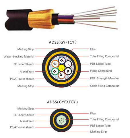 ADSS cable is loose tube stranded. Fibers, 250μm , are positioned into a loose tube made of high modulus plastics. The tubes are filled with a water-resistant filling compound. The tubes (and fillers) are stranded around a FRP (Fiber Reinforced Plastic) as a non-metallic central strength member into a compact and circular cable core. After the cable core is filled with filling compound. it is covered with thin PE (polyethylene) inner sheath. After stranded layer of aramid yarns are applied over the inner sheath as strength member, the cable is completed with PE or AT (anti-tracking) outer sheath.