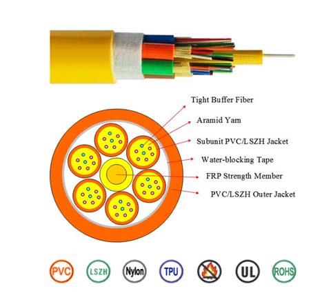 24~144 fiber, Stranded structure, FRP strength member, 24--144 -fiber subunit (Φ900μm Tight buffer, Aramid yarn), PVC Jacket.