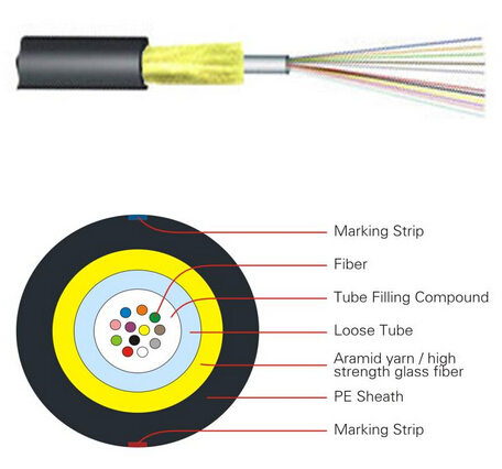 The fibers,250μm, either of single-mode or multimode type, are positioned in a loose tube made of a high modulus plastic. The tubes are filled with a water-resistant filling compound. A layer of aramid yarn or high strength glass is applied around the cable core as additional strength member. Then, the cable is completed with a black or color HDPE sheath.