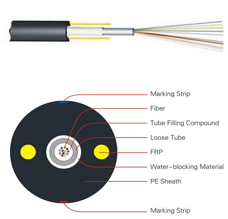 The fibers, 250μm, are positioned in a loose tube made of a high modulus plastic. The tubes are filled with a water-resistant filling compound. Over the tube. water-blocking material is applied to keep the cable watertight. Two parallel Fiber Reinforced Plastics (FRP) are placed at the two side. The cable is completed with a polyethylene(PE) sheath.